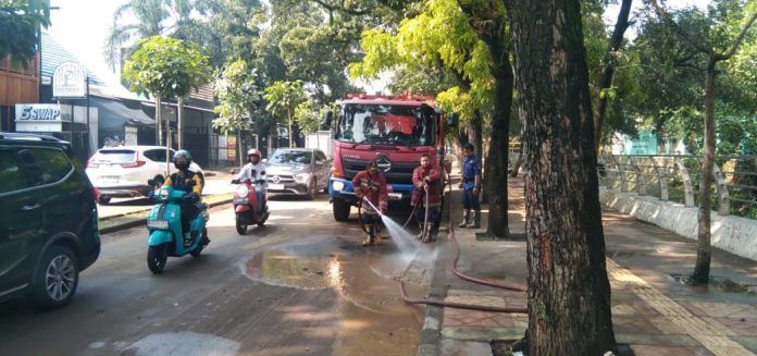 Penyemprotan dilakukan menggunakan mobil pemadam kebakaran dengan kapasitas tangki penuh air.