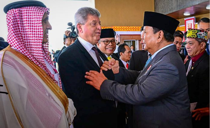 Tidak berhenti di situ, Presiden Prabowo juga melangkah ke deretan tamu internasional, menyapa dan menyalami sejumlah Ketua Parlemen ASEAN yang hadir, serta para duta besar negara sahabat. Sambil sesekali berbincang singkat, suasana menjadi akrab dan cair, mencerminkan diplomasi yang hangat di tengah forum resmi.